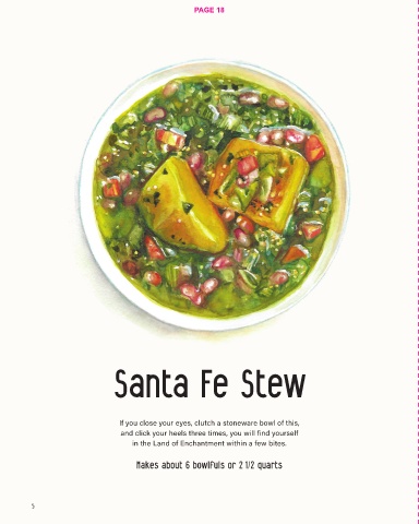 PAGE 18 Santa Fe Stew If you close your eyes, clutch a stoneware bowl of this, and click your heels three times, you will find yourself in the Land of Enchantment within a few bites. Makes about 6 bowlfuls or 2 1/2 quarts 5