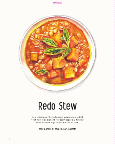 PAGE 22 Redo Stew A re-imagining of the freshness of autumn in a way that you’ll want to do over and over again, especially if served topped with fried sage leaves. Run that hit back… Makes about 10 bowlfuls or 4 quarts 9